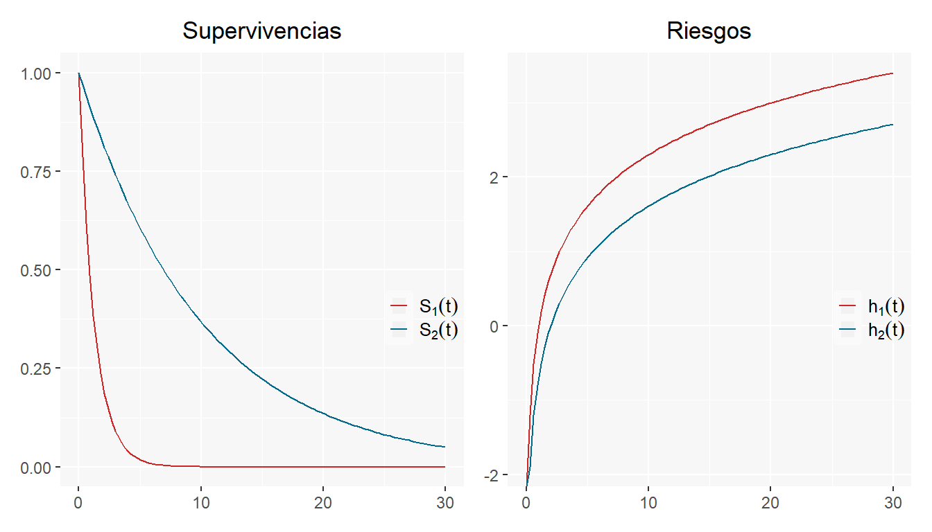 donde \(S_0(t)=exp\{-H_0(t)\}\) es la función de supervivencia base y \(H_0(t)\) la función de riesgo acumulado base. Una consecuencia del supuesto de proporcionalidad entre los riesgos de dos individuos \(i,j\) con covariables \(X_i,X_j\) es que las funciones de riesgo y supervivencia no se intersectan.