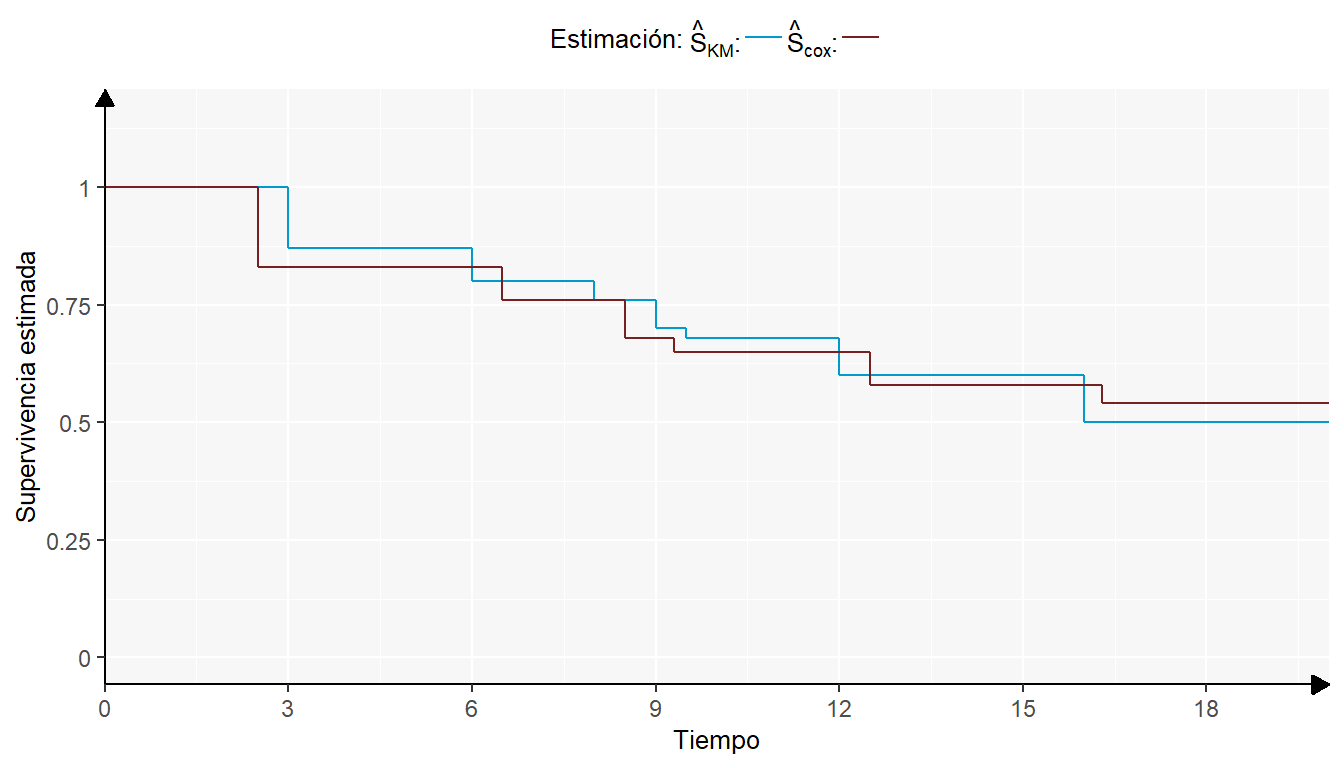 \[ \hat{S}(t|X^{*})=\hat{S}_0(t)\exp\left\{\hat{\theta^{'}}X^{*}\right\} \] La siguiente gráfica es un ejemplo comparativo de dos estimaciones de funciones de supervivencia, una con el método de Kaplan-Meier y Cox.