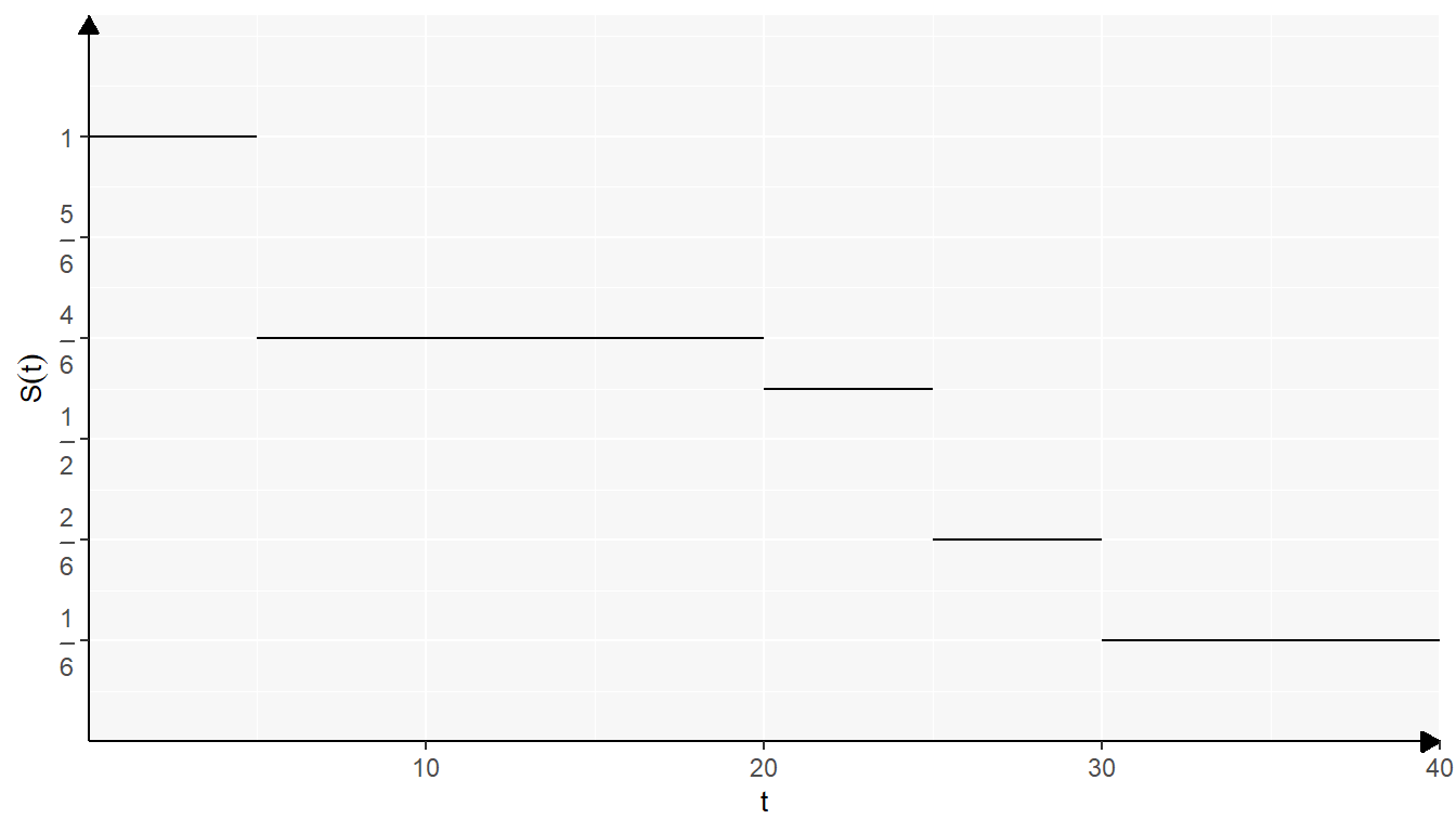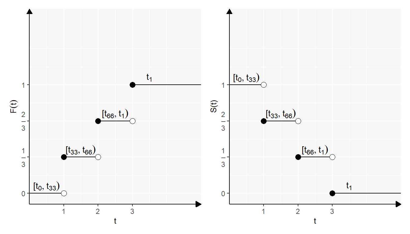 - Función de supervivencia de \(T\): \(S(t) = \mathbb{P}(T>t)=\left\{\begin{array}{ll}1 & \mbox{si }t=1\\\frac{2}{3} & \mbox{si } t=2\\\frac{1}{3} & \mbox{si } t = 3\\0 & \mbox{si }t>3\end{array}\right.\)